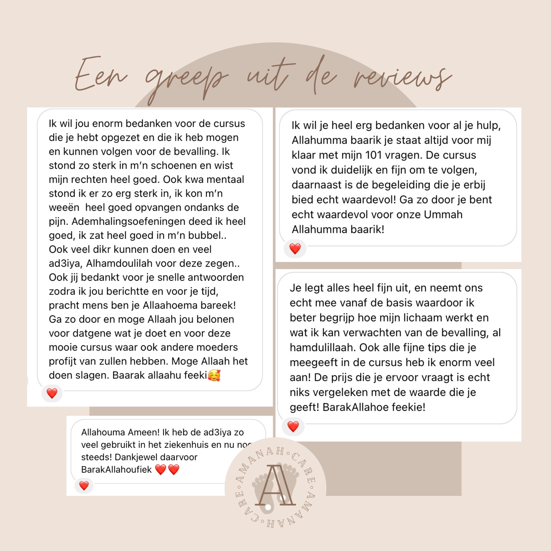 Let op! Er rust copyright op deze online cursus, Amanah Care is een officieel merk en aangesloten bij het Benelux-Bureau voor de Intellectuele Eigendom (BOIP). De cursus mag alleen gebruikt worden door de koper (en de geboortepartner). Het is ten eerste islamitisch en ten tweede wettelijk gezien niet toegestaan om auteursrecht te schenden. Amanah Care NL geeft geen toestemming voor het verveelvoudigen, delen, kopiëren of verspreiden van de online cursus. Bij het aankopen van de cursus gaat u hiermee akkoord. Zie ook onze Algemene Voorwaarden.
